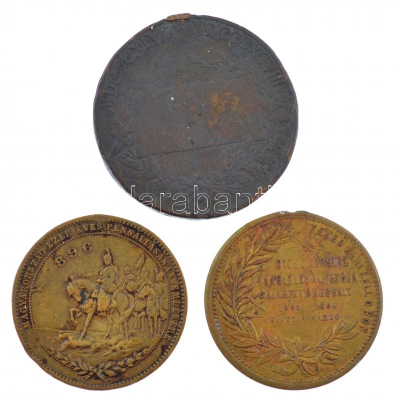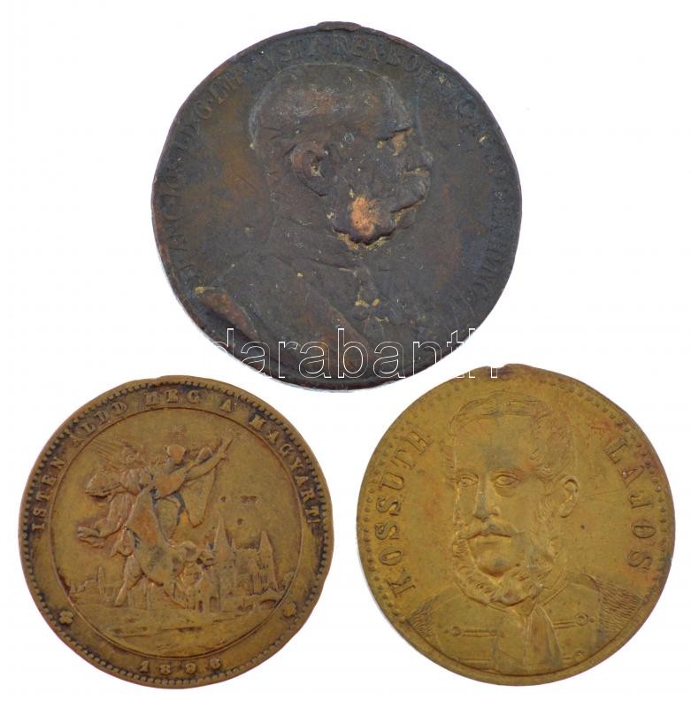 Vegyes: 1894. "Kossuth Lajos / Dicső korszak lánglelkű alkotója" bronz emlékmedál fül nélkül (29mm) + 1896. "Jubileumi emlékérem" bronz emlékérem. "MAGYARORSZÁG EZER ÉVES FENNÁLLÁSÁNAK EMLÉKÉRE / ISTEN ÁLDD MEG A MAGYART" (28mm) + Mixed: 1898. "Jubileumi Emlékérem a Fegyveres Erő Számára / Signum memoriae (AVSTR)" bronz kitüntetés mellszalag és fül nélkül, sérült állapotban T:2-,3 fny., ph., patina