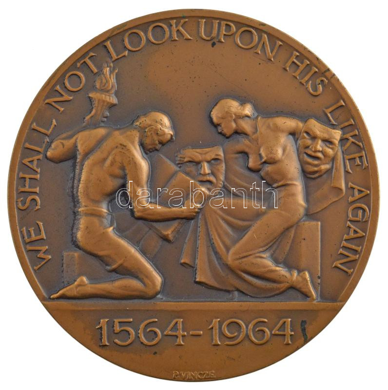 Vincze Pál (1907-1994) 1964. "William Shakespeare születésének 400. évfordulója / Mását e földön nem látjuk soha 1564-1964 (we shall not look upon his like again)" kétoldalas, angol nyelvű bronz emlékérem, nem eredeti tokban (57mm) T:1,1- patina