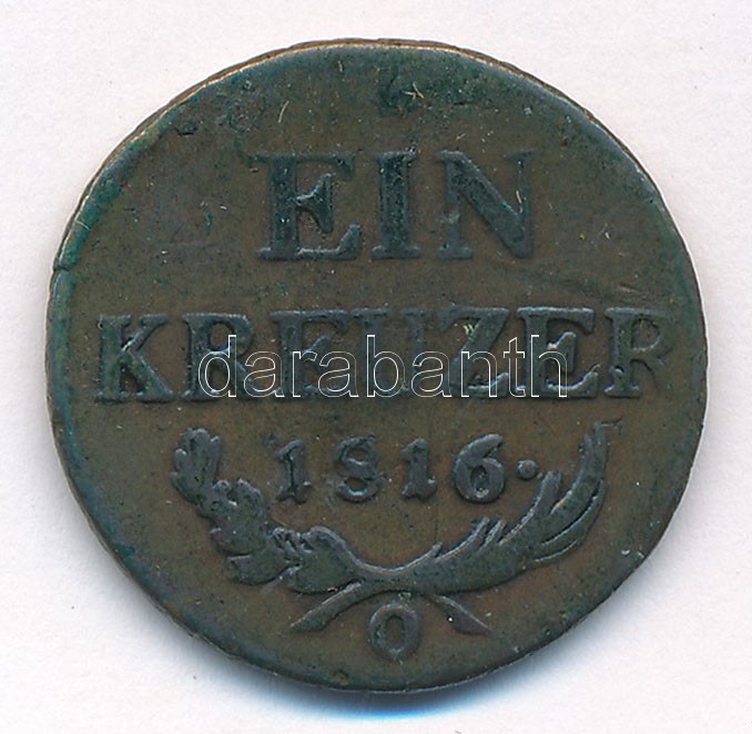 1816O 1kr Cu T:3 Unger III.: 1406.d, Huszár: 2061. https://www.darabanth.com/de/429-Fernauktion/429.0/Numismatik/Ungarische-Munzen-und-Munzen-mit-ungarischem-Munzzeichen~2000010/1816O-1kr-Cu-T3-Unger-III-1406d-Huszar-2061~II2703319