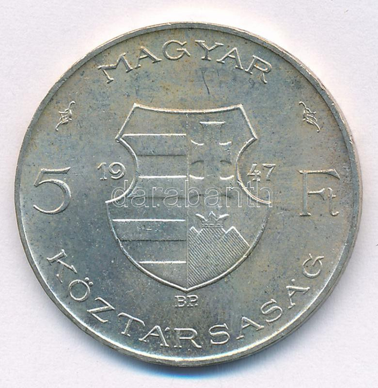 Adamo F8.1 https://www.darabanth.com/de/429-Fernauktion/429.0/Numismatik/Ungarische-Munzen-und-Munzen-mit-ungarischem-Munzzeichen~2000010/1947-5Ft-Ag-Kossuth-T1-patina--Adamo-F81~II2757575