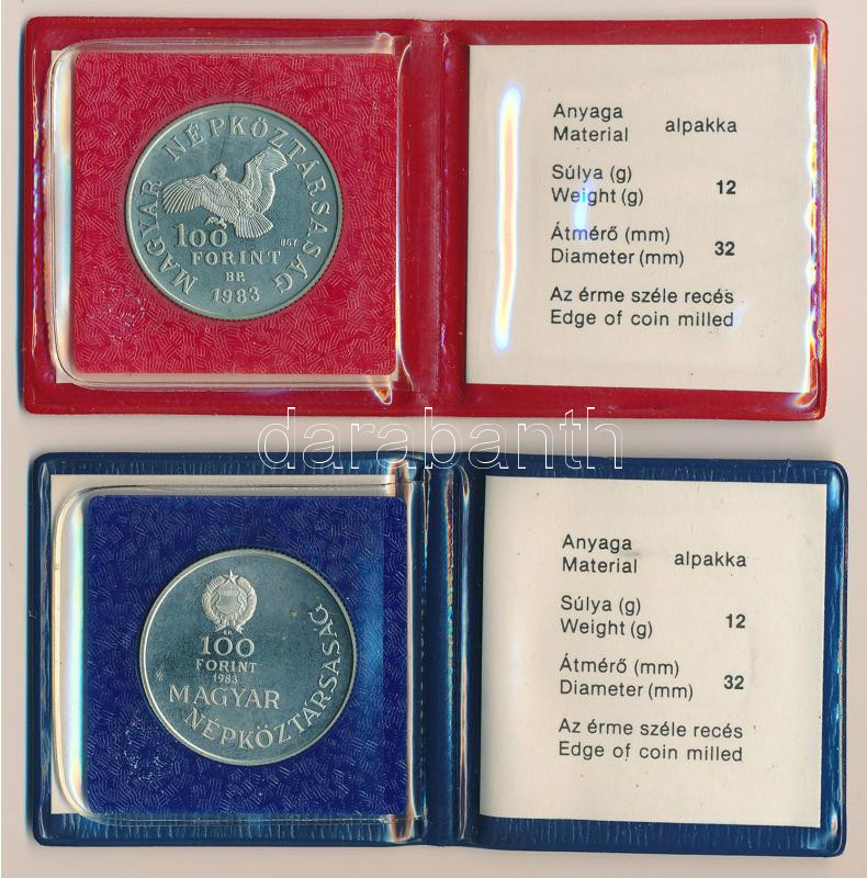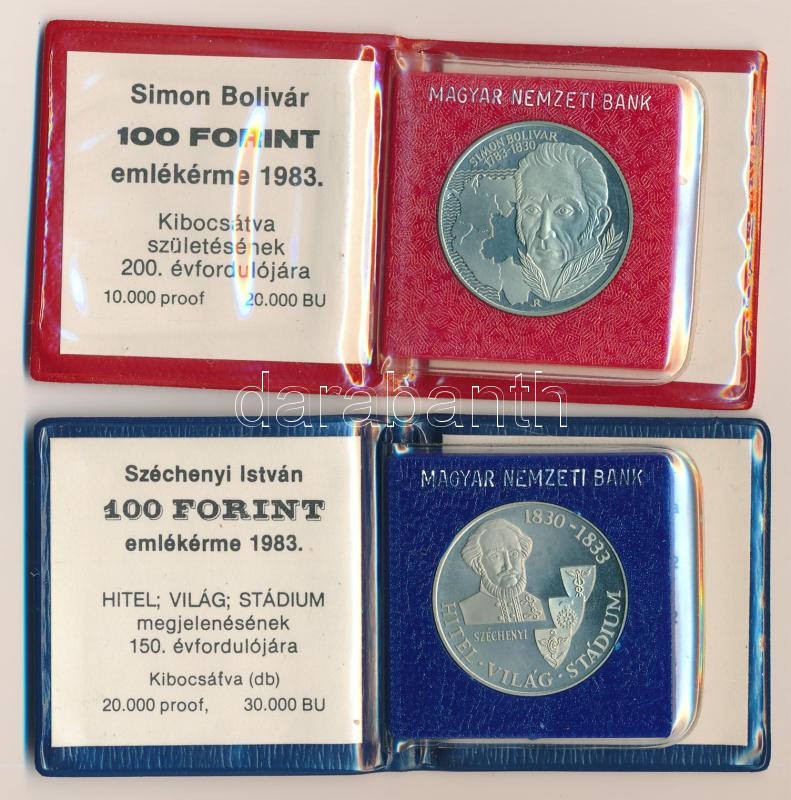 Beschreibung: 1983. 100Ft alpakka "Simon Bolivár" műbőrtokban, tanúsítvánnyal + 1983. 100Ft alpakka "Széchenyi István" tokban, tanúsítvánnyal T:1 (eredetileg PP)
