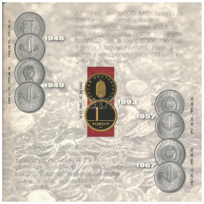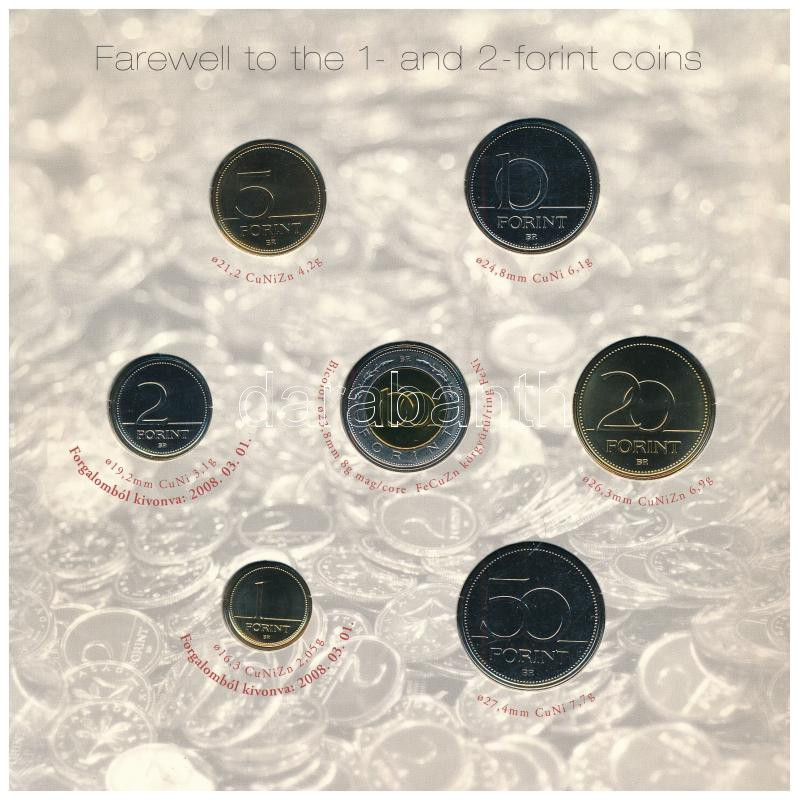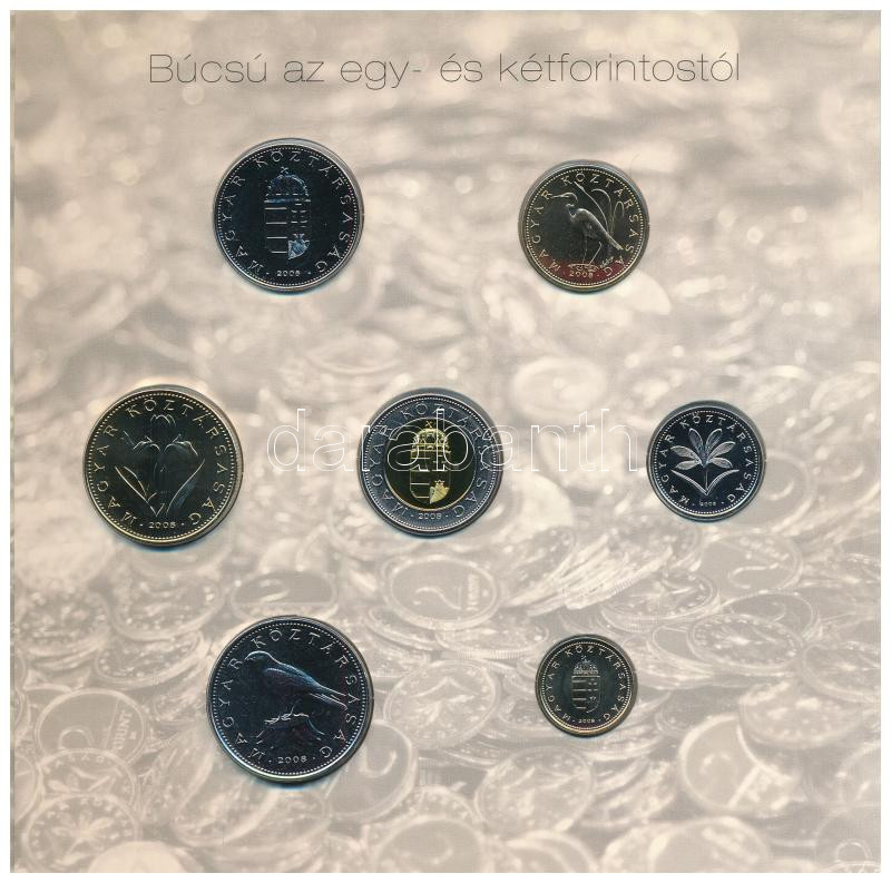 2008. 1Ft-100Ft (7xklf) "Búcsú az egy- és kétforintostól" fo... https://www.darabanth.com/de/429-Fernauktion/429.0/Numismatik/Ungarische-Munzen-und-Munzen-mit-ungarischem-Munzzeichen~2000010/2008-1Ft-100Ft-7xklf-Bucsu-az-egy-es-ketforintostol-forgalmi-sor-szettben-TBU--Adamo-FO~II2751126