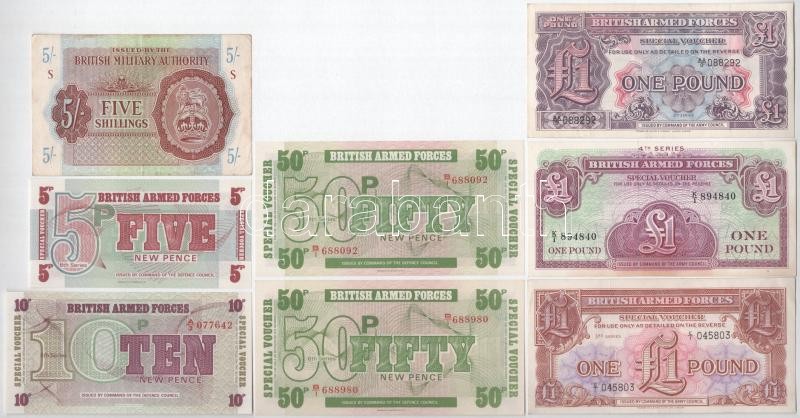 Great Britain / British Military Authority / British Armed Forces ND (1943) 5 Shillings + ND (1948-1962) 1 Pound (3xdiff series) + ND (1972) 5 New Pence + 10 New Pence + 50 New Pence (2x) C:UNC-F