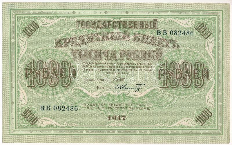 Orosz Birodalom 1917. 1000R T:II Russian Empire 1917. 1000 Rubles C:XF... https://www.darabanth.com/de/429-Fernauktion/429.0/Numismatik/Weltweit-Banknoten~2000014/Orosz-Birodalom-1917-1000R-TII-Russian-Empire-1917-1000-Rubles-CXF-Krause-P2337~II2732474