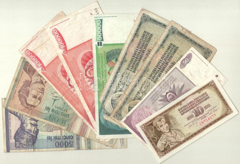 Beschreibung: Vegyes: Jugoszlávia 1965-1990. 10D-100.000D (7db, 5xklf) + Románia 1991. 1000L + 1993. 5000L T:I--IV