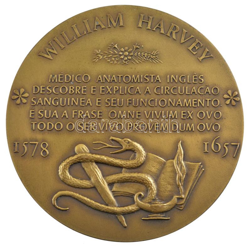 Portugal ND "William Harvey - MEDICO ANATOMISTA INGLES DESCOBRE E EXPLICA A CIRCULACAO SANGUINEA E SEU FUNCIONAMENTO É SUA A FRASE OMNE VIVUM EX OVO TODO O SER VIVO PROVEM DUM OVO 1578-1657" double-sided bronze plaque, with "357/500" serial number on edge. Sign.: Armindo Viseu (70mm) C:AU