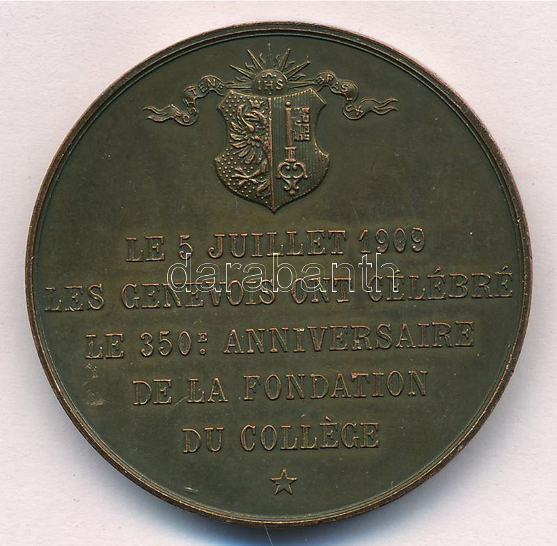 Svájc 1909. "LE 5 JUILLET 1909 LES GENEVOIS ONT CÉLÉBRÉ LE 350e ANNIVERSAIRE DE LA FONDATION DU COLL?GE" - a Genfi egyetem megalapításának emlékére. Kétoldalas bronz emlékérem. s: Chaponniére. d: 41 mm T: AU / Switzerland 1909 "Geneve Collége 350" bronze plaque d: 41 mm C: EU