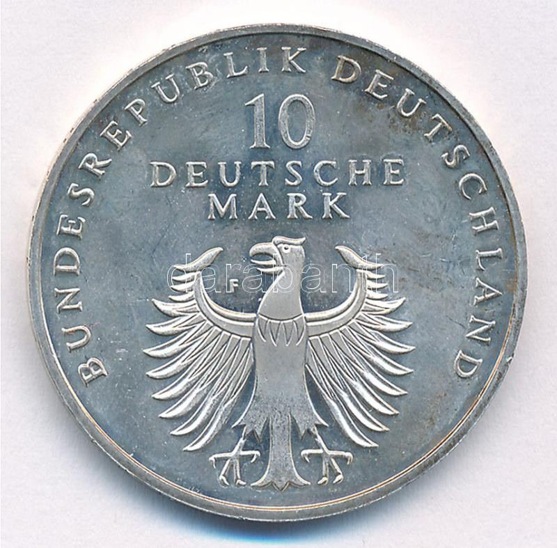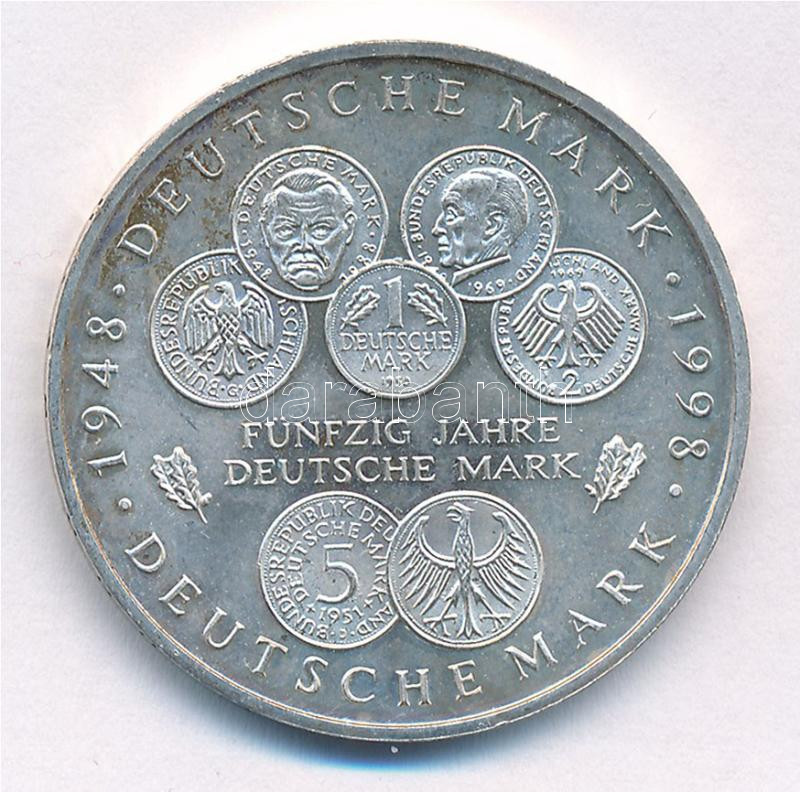 Németország 1998F 10M Ag "50 éves a Német Márka" T:1- kis patina Germany 1998F 10 Mark Ag "50 Years of the Deutsche Mark" C:AU small patina Krause KM#195