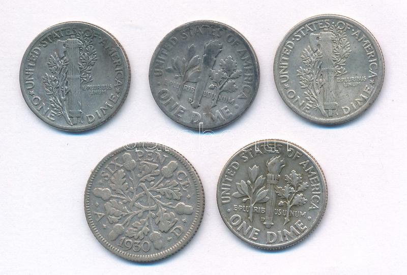 Mixed: USA 1919-1964. 1 Dime Ag (4xdiff) + Great-Britain 1930. 6 Pence Ag C:XF,F