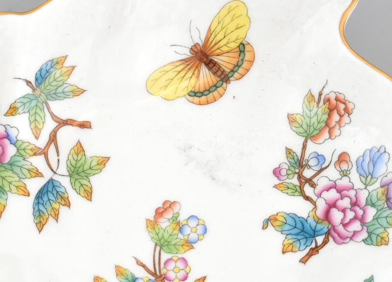Beschreibung: Herendi Viktória mintás leveles tál, kézzel festett, jelzett, fülénél kis repedés, 20×17,5 cm