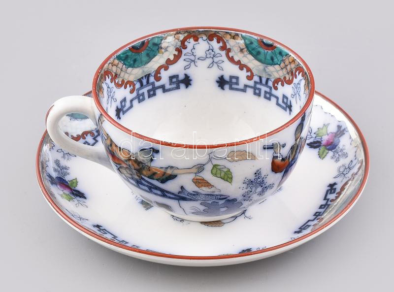 Beschreibung: Tomor Maestrich made in Holland teáscsésze aljjal. Kézzel festett kínaizáló porcelán, jelzett, hibátlan, 1900-20 körül.