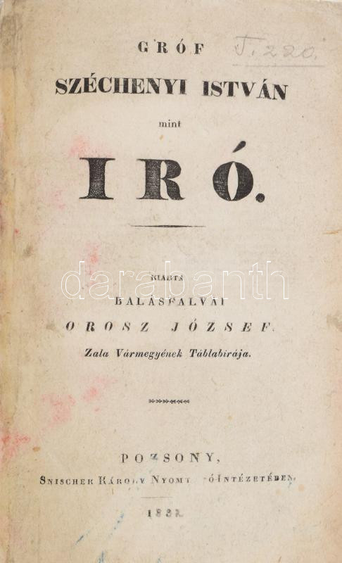 Orosz József, balásfalvai: Gróf Széchenyi István mint iró. Pozsony, 1832. Snischek Károly ny. (6)+409+(1)p. A Hitel és a Világ bírálata. A szerző, újságíró, több folyóirat (Századunk, Hírnök) szerkesztője volt. Amint az előszóból kiderül, Ponori Thewrewk József kritikáját is leközli. Korabeli enyhén kopottas kartonkötésben Szentkirályi: O-11.2.