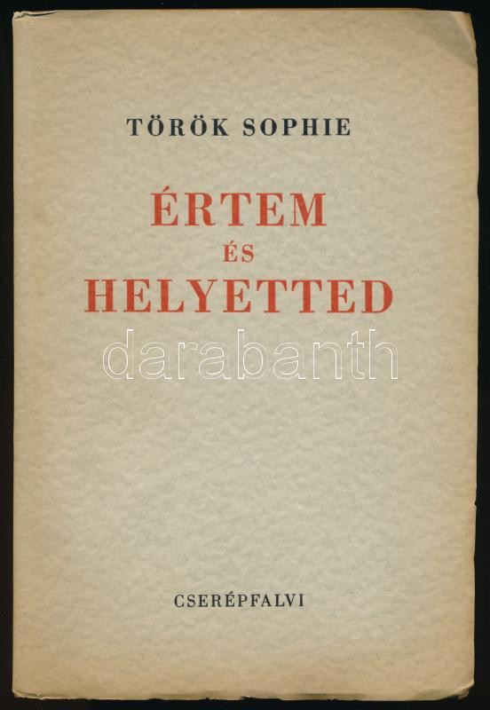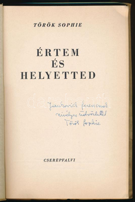 Török Sophie: Értem és helyetted. A szerző, Török Sophie (1895-1955) Baumgarten-díjas író, költő, Babits Mihály felesége által Jankovich Ferenc (1907-1971) Kossuth-, József Attila- és Baumgarten-díjas költő, író, műfordító részére DEDIKÁLT példány. [Bp.], 1940., Cserépfalvi, 111+1 p.+1 errata. Kiadói papírkötés.