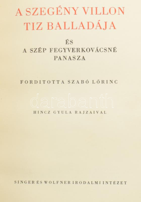 Villon, Francois: A szegény Villon tíz balladája és A szép fegyverkovácsné panasza. Fordította: Szabó Lőrinc. Hincz Gyula rajzaival. [Bp.], [1940], Singer és Wolfner,(Hungária-ny.), 71 p. Álbordás gerincű félbőr-kötésben, karton-tokban, kissé kopott borítóval, de egyébként jó állapotban. "Ez a bibliofil-kiadás száz példányban készült, különleges papíroson, három színben nyomva." Számozott (35./100) példány. A fordító, Szabó Lőrinc (1900-1957) Kossuth- és József Attila-díjas költő, műfordító és a grafikus, Hincz Gyula (1904-1986) Kossuth- és kétszeres Munkácsy Mihály-díjas magyar festő-, grafikusművész által ALÁÍRT példány! + Justh Béla: Botrány. Szabó Lőrinc és Vas István Villon - fordításának bírálata. Bp., 1940, Szerzői, (Madách-ny.), 31 p. Kiadói papírkötés, sérült, foltos borítóval.