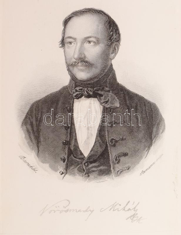 Vörösmarty Mihály: Vörösmarty összes munkái I-VIII. köt. Teljes kiadás. Rendezte és jegyzetekkel kísérte Gyulai Pál. I. kötet: Lyrai és vegyes költemények. Vörösmarty életrajzával. 1 (hártyapapírral védett címkép: Barabás Miklós (1810-1898) - Axmann József (1793-1873): Vörösmarty Mihály portréja, acélba metszette Barabás Miklós rajza után Axmann József) t. +2+468 p.; II. köt.: Epikai költemények 1825-1831. 490+2 p.; III-V. kötet: Drámai költemények 1821-1844. 492+1 p.; 460+2 p.; 438+2 p.; VI. kötet: Beszélyek és regék 1829-1837. Nyelv és irodalom. 391+3 p.; VII. kötet: Vegyes prózai dolgozatok 1826-1848. 396 p.; VIII. kötet: Vegyes maradványok 1830-1850. - Ifjúkori kísérletek 1817-1826. - Drámai költemények 1821-1824. 414 p. Bp., 1884-1885., Méhner Vilmos, (Rudnyánszky A. -ny.) Egységes kiadói aranyozott, festett egészvászon díszkötésben, aranyozott lapélekkel, a VIII. kötetből 6 lap (19-30), a könyvek sarkain egészen apró kopásnyomokkal, ezektől eltekintve szép állapotban.