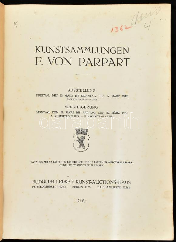 Kunstsammlungen F. von Parpart. Katalog zur Versteigerung vom 18. März bis zum 22. März 1912.