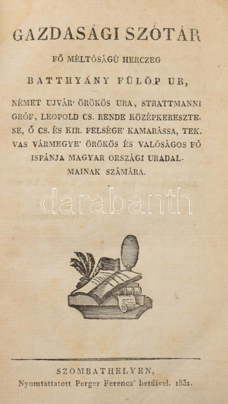 Bitnitz Lajos : Gazdasági szótár fő méltóságú herczeg Batthyány Fülöp ur, Német Ujvár örökös ura, strattmanni gróf, Leopold cs. rende középkeresztese, ő cs. és kir. felsége kamarássa, tek. Vas vármegye örökös és valóságos fő ispánja magyar országi uradalmainak számára. Szombathely, 1831. Perger Ferencz. 55 l. Fűzve, kiadói borítóban, különösen szép példány.