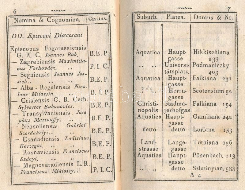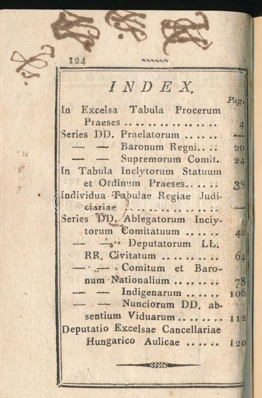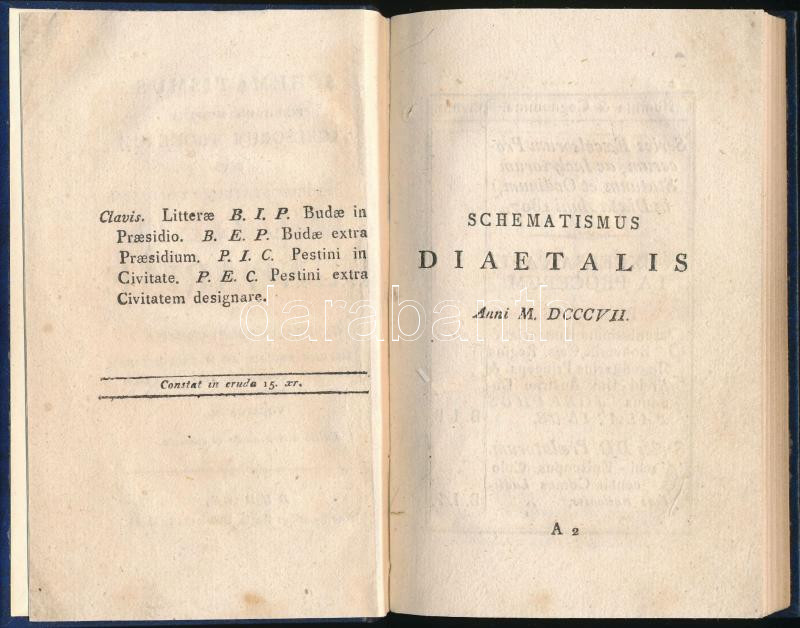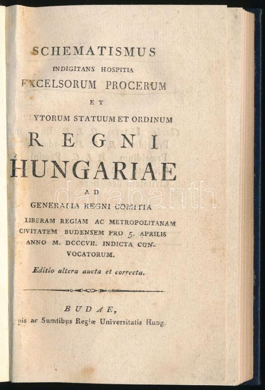 Schematismus indigitans hospitia excelsorum procerum et inclytorum statuum et ordinum Regni Hungariae, ad generalia regni comitia liberam regiam ac metropolitanam civitatem Budensem pro 5. aprilis anno M. DCCCVII. Indicta convocatorum. Editio altera aucta et correcta. Budae, 1807, Typis ac Sumtibus Regiae Universitatis Hung., 124 p. Latin nyelven. Átkötött modern műbőr-kötésben.