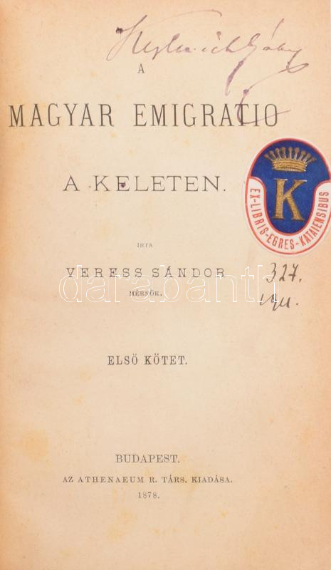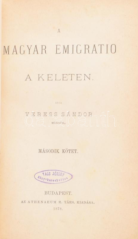 Veress Sándor: A magyar emigratio a Keleten. I-II. kötet. Bp., 1878, Athenaeum, 348+IV p.; 451+1+VI p. Átkötött modern egészvászon-kötés.