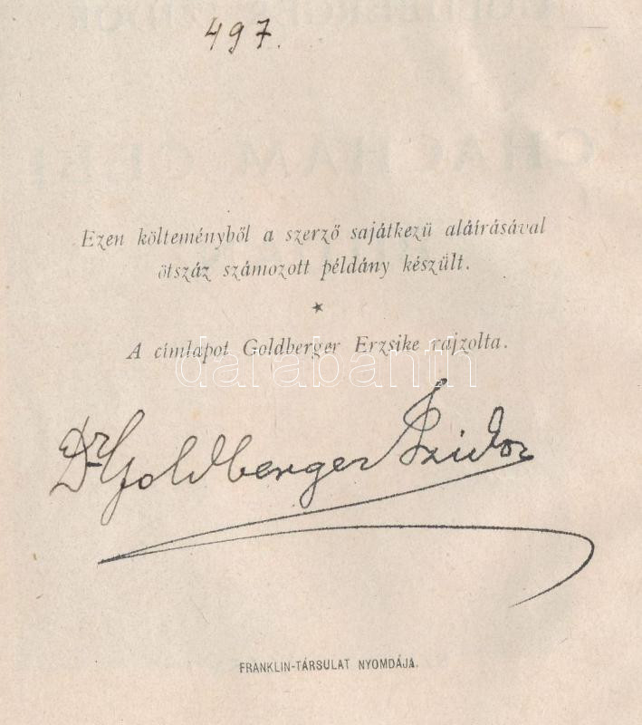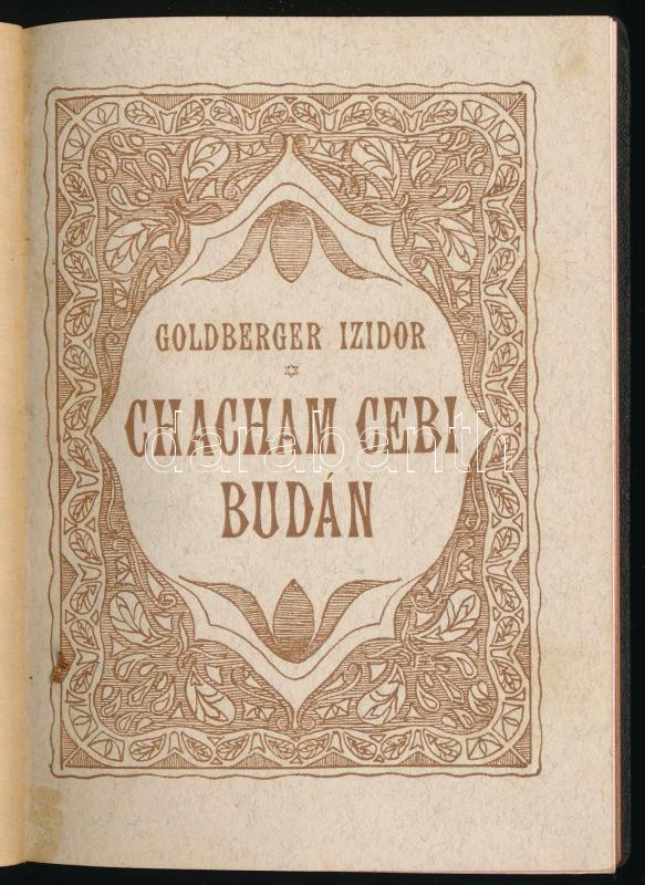 Goldberger Izidor (1876-1944): Chacham Cebi Budán. A címlap rajza Goldberger Erzsike munkája. Bp.,[1920], Szerzői, (Franklin-ny.), 1 t.+75 p. Első kiadás. Kiadói, vaknyomásos egészvászon kötésben, jó állapotban. Számozott (497./500) példány, kézzel számozott példány, a szerző aláírásával. A szerző tatai rabbi volt, a holokauszt áldozata lett. Ritka!