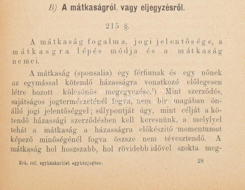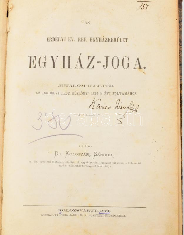 Dr. Kolosvári Sándor: Az Erdélyi Ev[angélikus] Ref[ormátus] Egyházkerület egyház-joga. Jutalom-illaték az "Erdélyért Prot. Közlöny" 1874-ik évfolyamához. Kolozsvár, 1874, Stein János, 484+1 p. Kolosváry Sándor (1840-1922) jogász, egyetemi tanár, egyházjogot is tanított. Később a kolozsvári egyetem dékánja, majd rektora. Korabeli félvászon-kötés, kopott, foltos borítóval, a címlapon bejegyzésekkel, bejelölésekkel és aláhúzásokkal kb. az 50. oldalig, két lapon gyűrődésnyomokkal, foxing foltos lapokkal. Ritka!