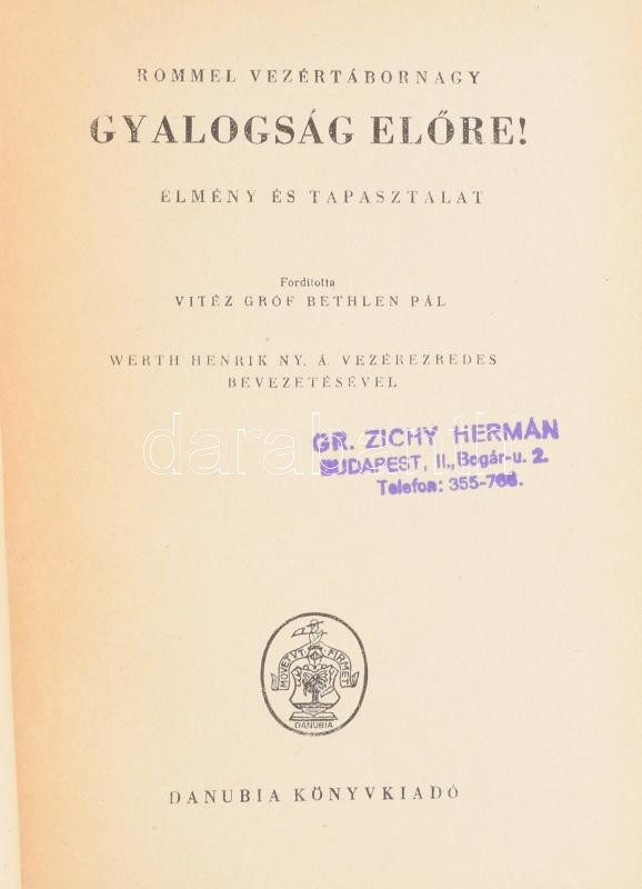 Rommel, Erwin: Gyalogság előre! Előre és tapasztalat. Ford. vitéz gróf Bethlen Pál. Werth Henrik ny. á. vezérezredes bevezetésével. [Bp., 1942.], Danubia,(Hungária-ny.), 340+2 p. Kiadói félvászon-kötésben, kopott, foltos borítóval, a hátsó táblánál a kötés javított, a hátsó szennylapot a hátsó tábla belsejéhez ragasztották. "Gróf Zichy Hermán" névbélyegzésével. A mű szerepel az Ideiglenes Nemzeti Kormány által 1945-ben kiadott, tiltott könyvek listáján.