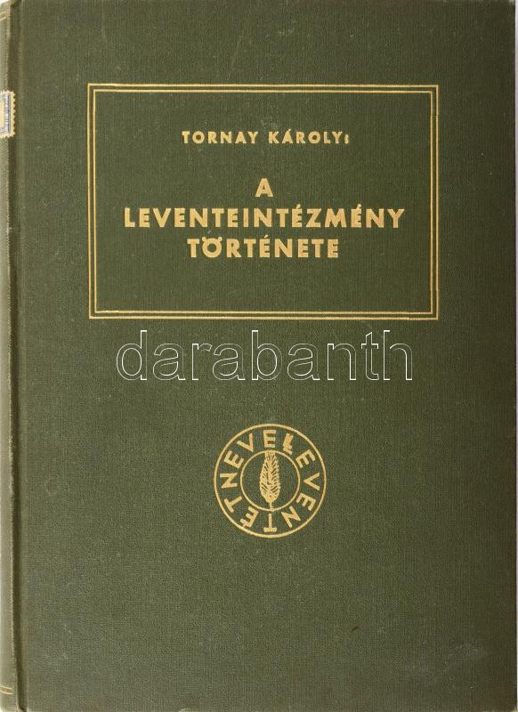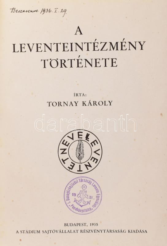 Tornay Károly: A leventeintézmény története. Bp., 1935., Stádium, 240 p. 1. kiadás. Gazdag fekete-fehér szövegközti képanyaggal illusztrált. "I. Dunaházhajózási Társaság Levente Egyesülete Pécsbányatelep" bélyegzéssel. Kiadói aranyozott egészvászon-kötés, a gerincen címkével.