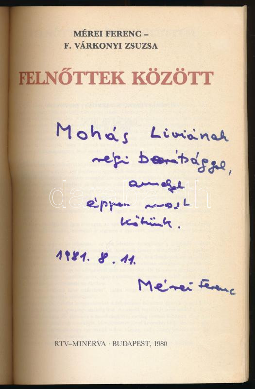 Mérei Ferenc - F. Várkonyi Zsuzsa: Felnőttek között. Az egyik szerző, Mérei Ferenc (1909-1986) pszichológus, klinikai gyermek-szakpszichológus által Mohás Lívia (1928-2024) pszichológus, József Attila-díjas írónak DEDIKÁLT példány, dátumozva (1981. 8.11.) Minerva Családi Könyvek. Bp., 1980, RTV - Minerva, 76+1 p. Kiadói papírkötés.