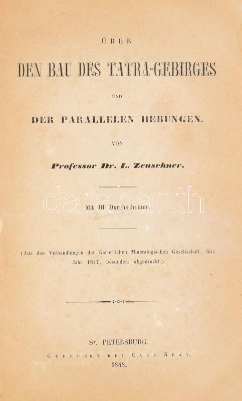 Zeuschner, Dr. L.: Über den Bau des Tatra-Gebirges und der paralellen Hebungen. St. Petersburg, 1848, Carl Kray. Félvászon kötés, gerinc szakadt, kopottas állapotban.