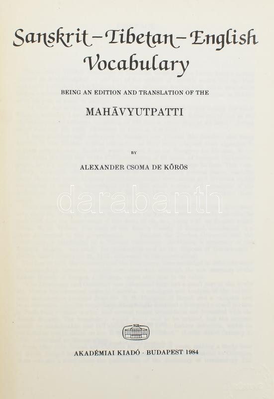 Collected Works of Alexander de Kőrös. 1-4. köt. Szerk.: Terjék József. 1. Sanksrit-Tibetan-English Vocabulary.+Alexander Csomda de Kőrös 1784-1842. A short biography.; 2. Tibetan - English Dictionary.; 3. Grammar of the Tibetan Language.+Alexander Csomda de Kőrös 1784-1842. A short biography.; 4. Tibetan Studies..; Bp., 1984, Akadémiai Kiadó, XXXVII+390+XXXI+1; LX+351; XVI+204+40+XXXI+1; IX+459 p. Angol, tibeti és szanszkrit nyelven. Kiadói aranyozott egészvászon-kötés, jó állapotban. Nagyon ritka! / Gilt linen-binding, in English,Tibetan, Sanksrit language. In Good condition. Very rare!