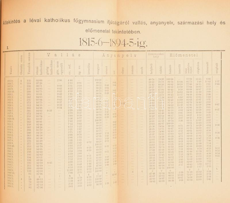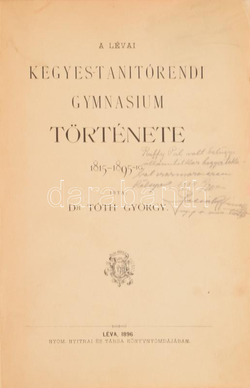 Tóth György: A lévai kegyes tanítórendi gymnasium története 1815-1895-ig. Léva, 1896, Nyitrai és Társa, 2+383+X+2 p.+1 t. Egészvászon-kötésben,Lévai Nyitrai és Társa-kötés, kopott, foltos borítóval, ceruzás aláhúzásokkal és bejelölésekkel, a címlapon későbbi (1934) ceruzás ajándékozási sorokkal. Ritka!