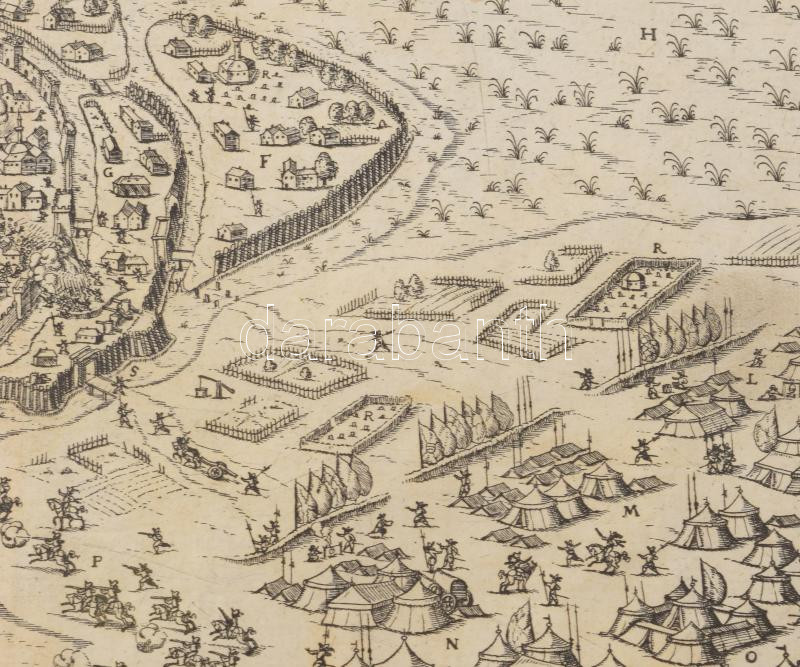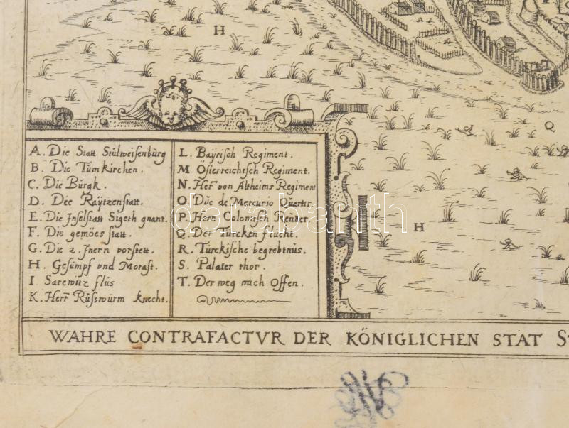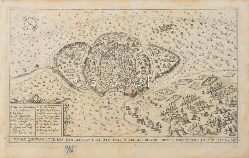 [Székesfehérvár vár és város rézmetszetű látképe, 1601] Címe a kép alatt: ,,Wahre Conterfactur der Königlichen stat Stvlweisenbvrg wie die von den christen erobert worden Anno 1601." Johann Sibmacher (?-1611) rézmetszete. A metszeten A-T-ig betűk, amelyek magyarázata a bal alsó sarokban olvasható. Megjelent: Hieronymus Ortelius ,,Chronologia oder Historische Beschreibung aller Kriegsempörungen..." című művében (Nürnberg, 1603.). Képméret: 15,8×25,8 cm. Jó példány.