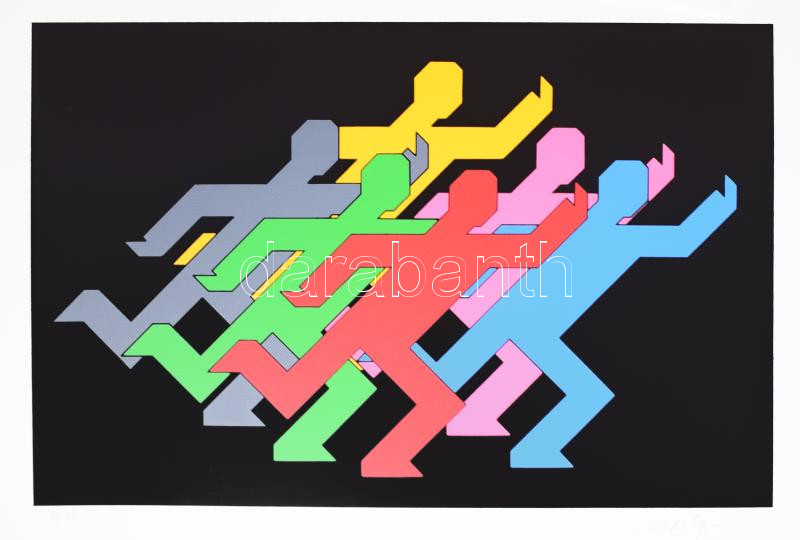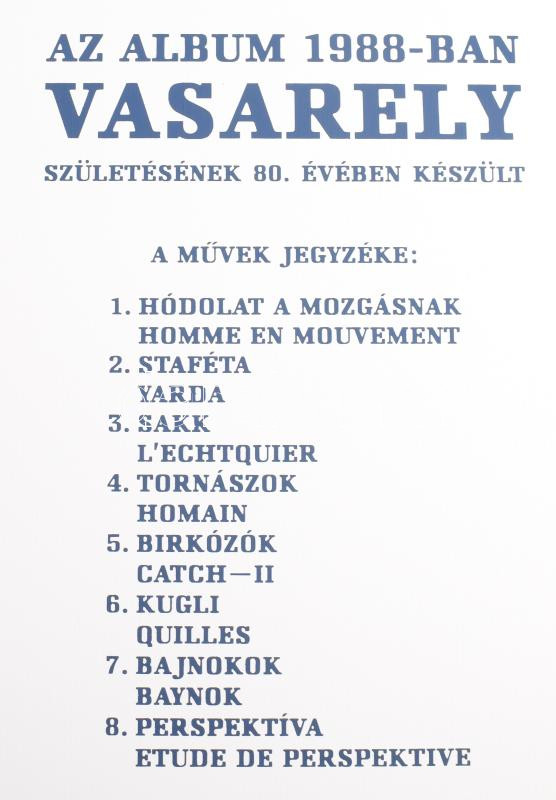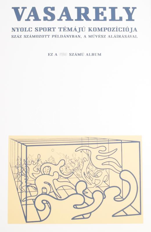 Victor Vasarely (1908-1997): Nyolc sport témájú kompozíciója, 1988. Szitanyomat, papír, egyenként jelzett, számozott (19/100), lapméret: 70×50 cm. Ifjúsági Lap- és Könyvkiadó kiadása. Kiadói vászon borítású mappában, számozott fedlappal. Komplett, hiánytalan gyűjtői darab! / 8 pcs of screenprint on paper, all of them signed, complete collector"s item!