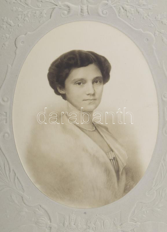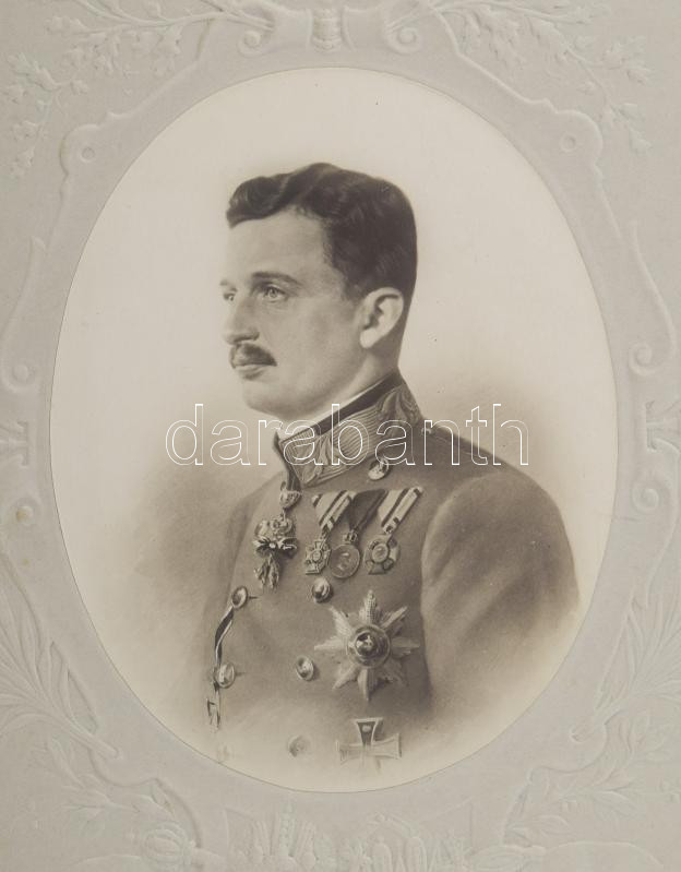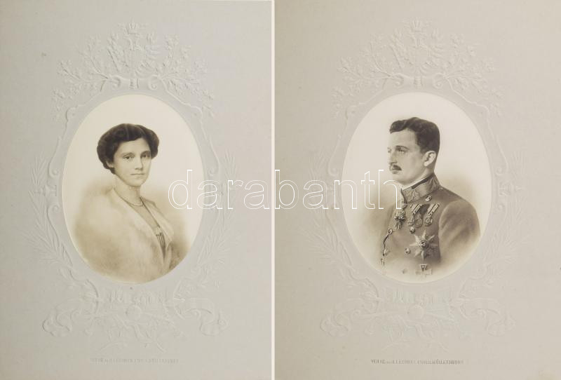cca 1916 Károly osztrák császár és magyar király valamint Zita királyné hivatalos dísz portréja. Dombornyomott címeres és a magyar és osztrák koronát ábrázoló díszes karton paszpartuban, szép állapotban. / Official decorative portrait of Emperor Charles of Austria and King of Hungary and Queen Zita. Embossed coat-of-arms and the decorative cardboard showing the Hungarian and Austrian crowns, in beautiful condition.