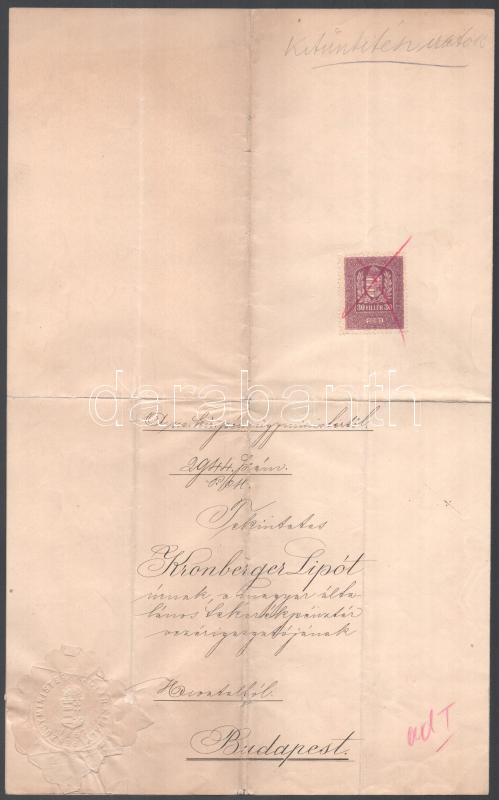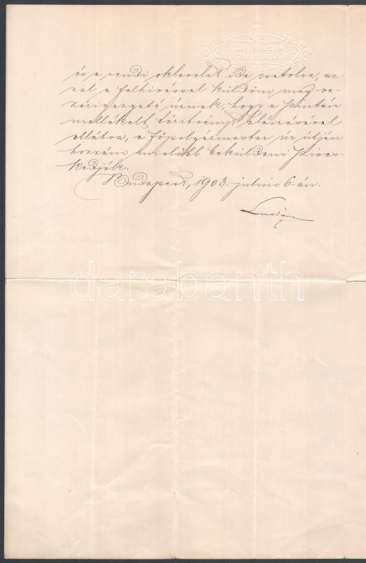 1903 Kronberger Lipót (1846-1924) zsidó származású bankár, a Magyar Általános Takarékpénztár Rt. vezérigazgatójának, Lukács László (1850-1932) pénzügyminisztertől, (első Khuen-Héderváry-kormány, (1903. június 27. - november 3.)), a Kronbergernek adományozott Ferencz József-rend lovagkeresztjét érintő hivatali ügyről szóló levél, Lukács László autográf aláírásával, fejléces papíron, borítékkal, szakadt. Budapest, 1906. jul. 6-án.