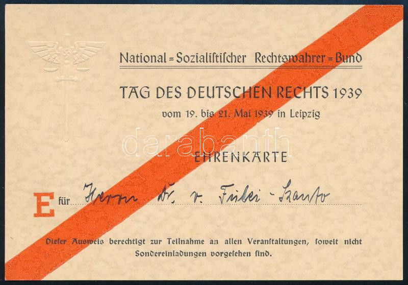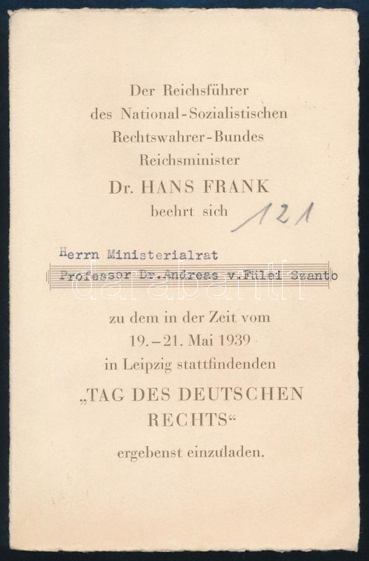 1939 Dr. Hans Frank birodalmi miniszter meghívója a "Tag des Deutschen Rechts" c. rendezvényre Fülei Szántó Endre (1890-1958) jogász, egyetemi tanár, író részére, szakadt.