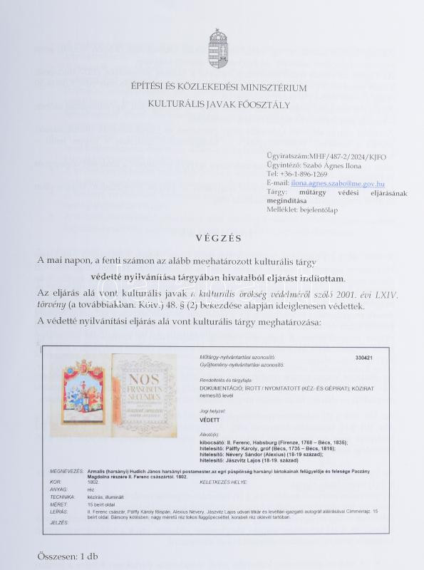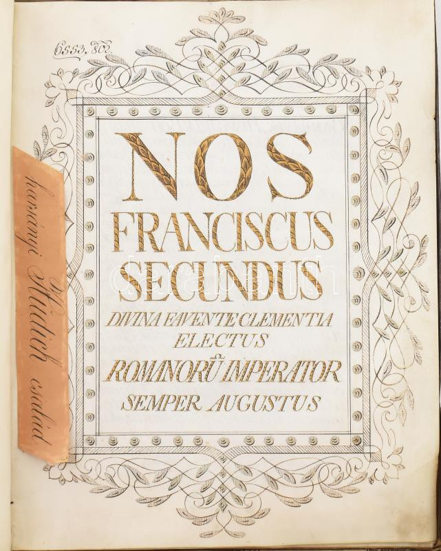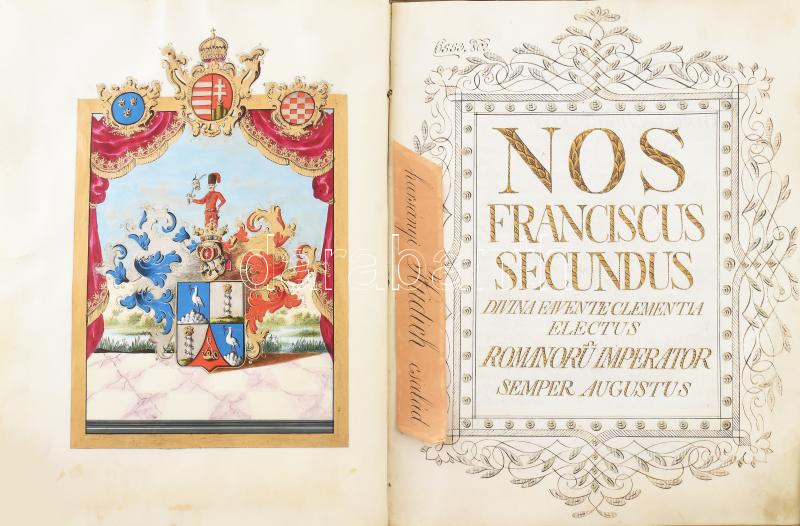 VÉDETT / NO EXPORT! 1802 Címereslevél - Armalis (harsányi) Hudich János harsányi postamester,az egri püspökség harsányi birtokainak felügyelője és felesége Paczány Magdolna részére II. Ferenc császártól. II. Ferenc császár, Pálffy Károly (1735-1816) főispán, Alexius Névery, Jászvitz Lajos udvari titkár és levéltári igazgató autográf aláírásával Címmerrajz + 15 beírt oldal. Bársony kötésben, nagy méretű réz tokos függőpecséttel, korabeli réz oklevél tartóban. Szép állapotban