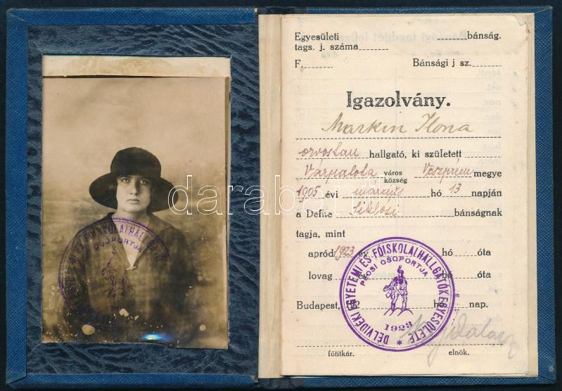 1913 Délvidéki Egyetemi és Főiskolai Hallgatók Egyesülete fényképes ig... https://www.darabanth.com/de/43-Gross-Auktion/43.1/Kunst-Skulpturen-Historische-Dokumenten-andere-Sammelgebiete/Dokument~17557/1913-Delvideki-Egyetemi-es-Foiskolai-Hallgatok-Egyesulete-fenykepes-igazolvany~II3228690