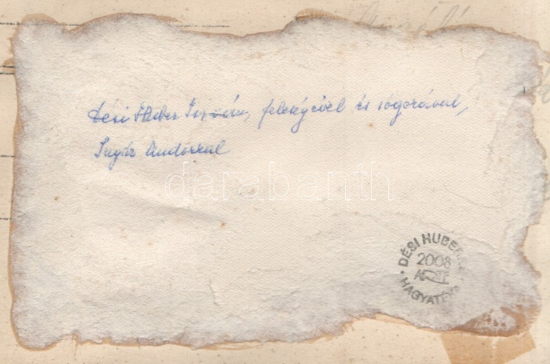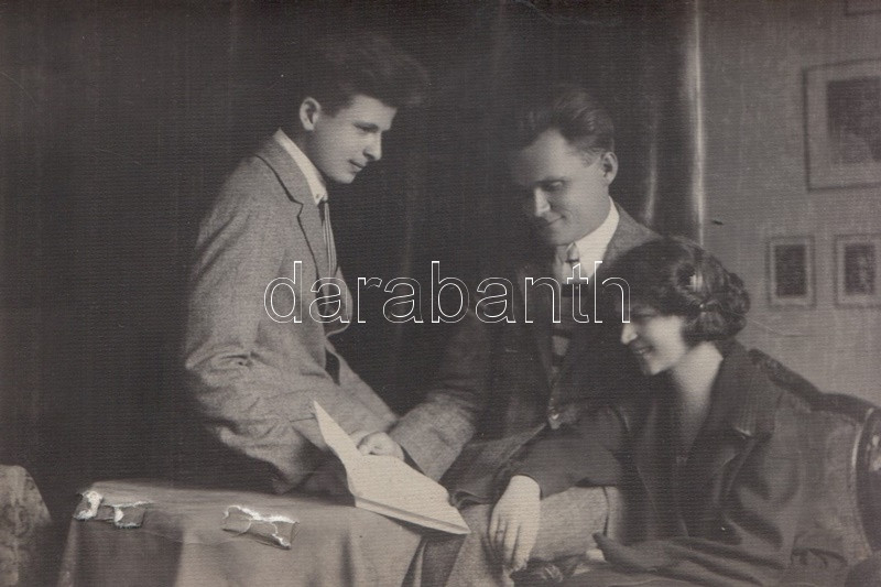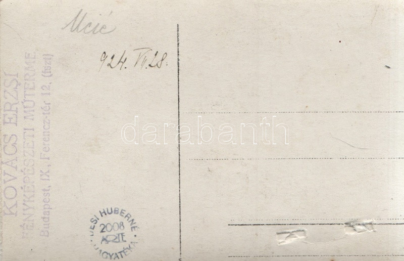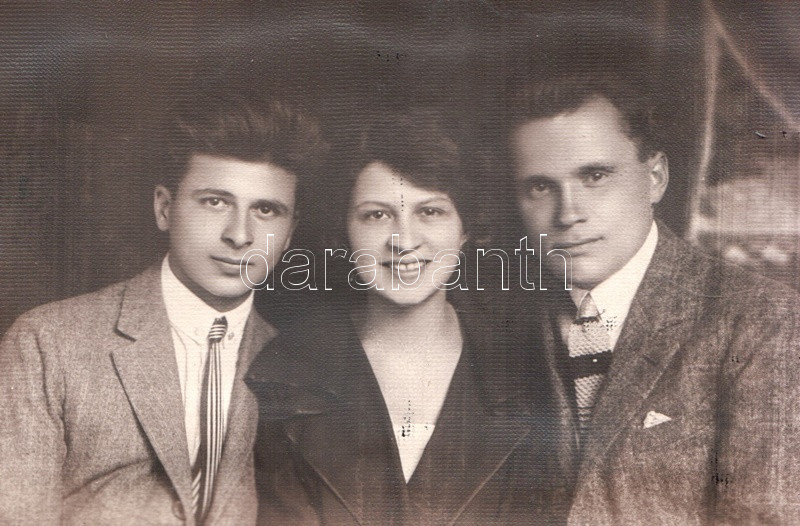 [Fotó] Dési Huber István festőművész neje, Sugár Stefánia és sógora, Sugár Andor festőművész társaságában. Két felvétel, készült Kovács Erzsi műtermében (1924). Vintázs, zselatinos ezüst nagyítású felvételek, méretük: 84x127 mm, illetve 82x130 mm. Dési Huber István festőművész (1895-1944) és sógora, Sugár Andor festőművész (1903-1944) 1924-ben együtt indultak neki olaszországi útjuknak, melynek során ékszerkészítőként dolgoztak. A kor műtermi beállításainak viselkedésrendjét tükröző két családi felvétel feltehetően a művészi befutást megelőző nagy vándorút előtt készült, készültének pontos időpontja az ülő portré hátoldalán. Archív fotóink az író leveleskönyvében jelentek meg nyomtatásban (Levelek a szülőföldre, Bukarest, 1982, Kriterion). A fotókon apró sérülések, egyikük körbevágva, mindkettő hátoldalán Dési Huber Istvánné hagyatéki bélyegzése. Prov.: Dési Huberné Sugár Stefánia hagyatéka.