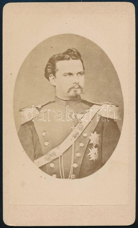 cca 1870-80 Wittelsbach II. Lajos bajor király (1845-1886) kitüntetésekkel dekorált portréja, keményhátú fotó, jelzés nélkül, 10,5×6 cm / cca 1870-80 Ludwig II, King of Bavaria/König von Bayern (1845-1886), highly decorated, vintage photo, unsigned, 10,5×6 cm