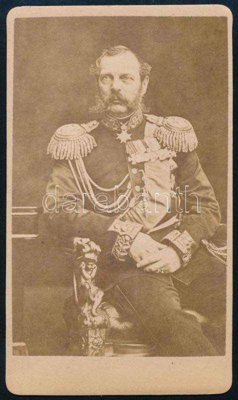 cca 1870 II. Sándor orosz cár portréja kitüntetésekkel, keményhátú fotó, jelzés nélkül, 10×6 cm / cca 1870 Portrait of Alexander II, Emperor of Russia, highly decorated, vintage photo, unsigned, 10×6 cm
