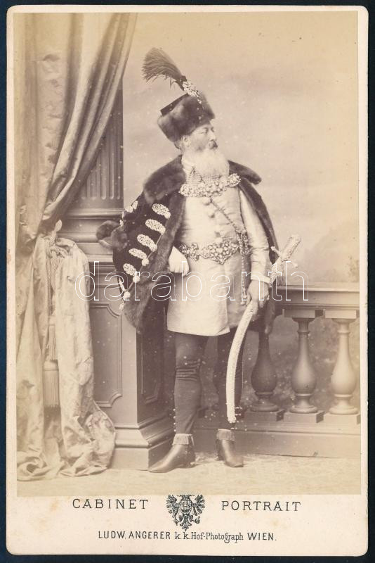 cca 1875-1880 zicsi és vázsonykői gróf Zichy Edmund (1811-1894) császári és király kamarás, belső titkos tanácsos, főrendiházi tag, műgyűjtő; gróf Zichy Ödön és Zichy Domonkos püspök testvére; az osztrák-magyar északi-sarki expedíció (1872-1874) egyik fő támogatója (Johann Wilczek mellett); egészalakos portré, díszmagyarban, kezében szablyával. Kabinetfotó Ludwig Angerer cs. kir. udvari fényképész bécsi műterméből, jó állapotban, 16,5x10,5 cm