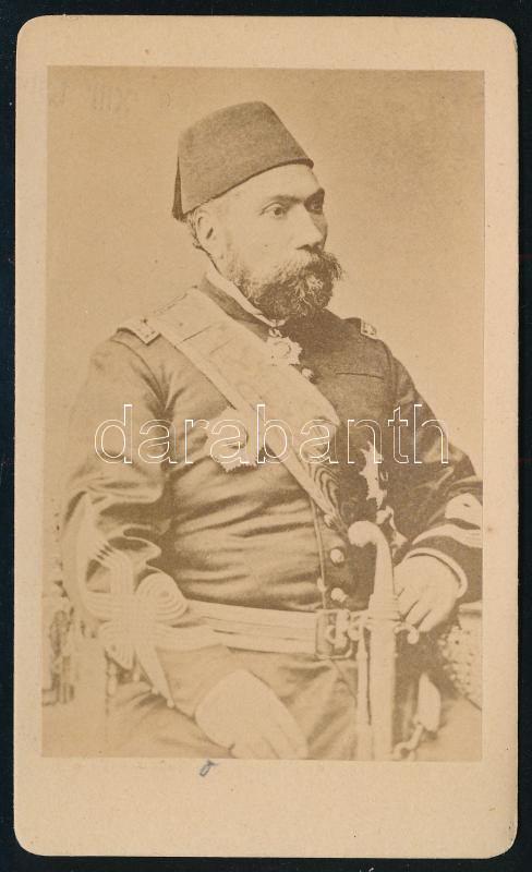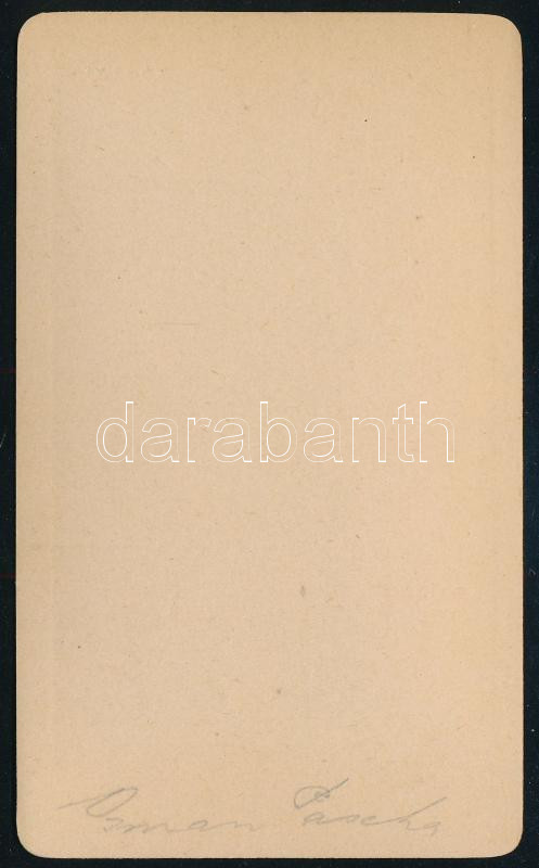 cca 1880 Oszmán pasa (Gázi Oszmán pasa, ill. Oszmán Nuri pasa néven is ismert) (1832-1900) török katonai vezető, marsall (müsir), többek közt a krími háború (1853-56), Plevna ostroma és az orosz-török háború (1877-78) során tanúsított katonai érdemeivel tüntette ki magát; vizitkártya, 10x6 cm / cca 1880 Osman Nuri Pasha (also known as Gazi Osman Pasha) (1832-1900) Ottoman Turkish field marshal (müsir), he distinguished himself with his military feats during the Crimean War (1853-56), the Siege of Plevna and the Russo-Turkish War (1877-78); CDV photo, 10x6 cm