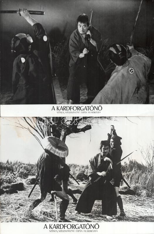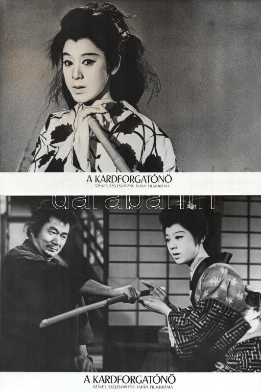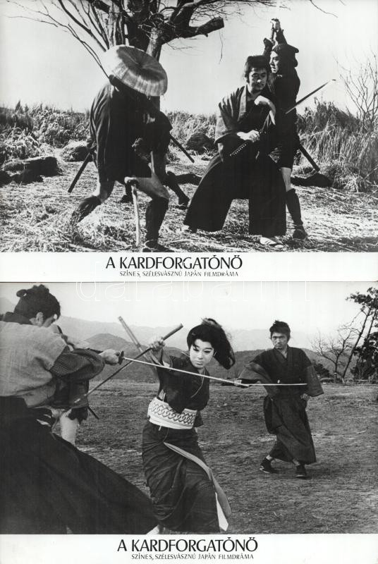cca 1989 előtt készült, ,,A kardforgató nő" című japán film jelenetei és szereplői, 16 db vintage produkciós filmfotó (vitrinfotó, lobbyfotó) ezüst zselatinos fotópapíron, a használatból eredő (esetleges) kisebb hibákkal, 18x24 cm