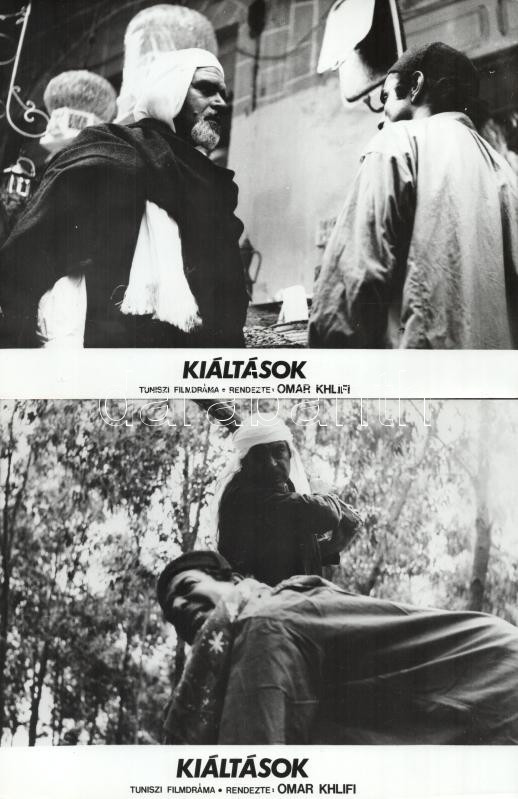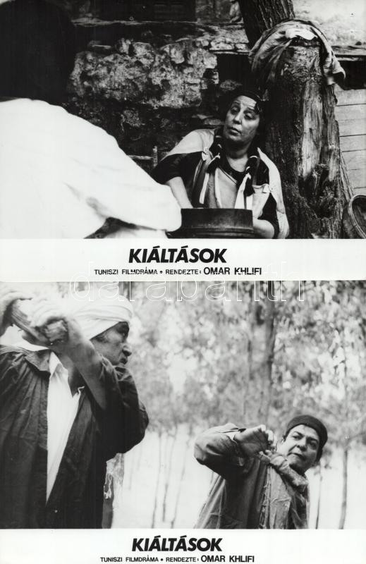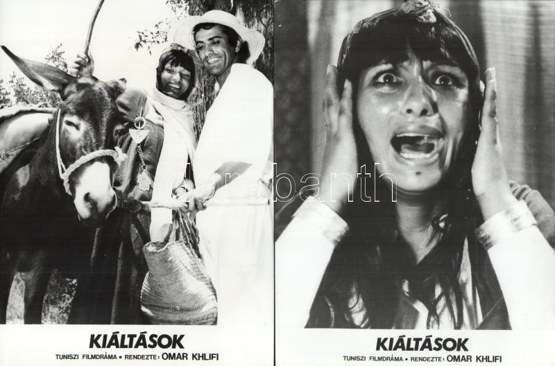 cca 1989 előtt készült, ,,Kiáltások" című tuniszi film jelenetei és szereplői, 15 db vintage produkciós filmfotó (vitrinfotó, lobbyfotó) ezüst zselatinos fotópapíron, a használatból eredő (esetleges) kisebb hibákkal, 18x24 cm