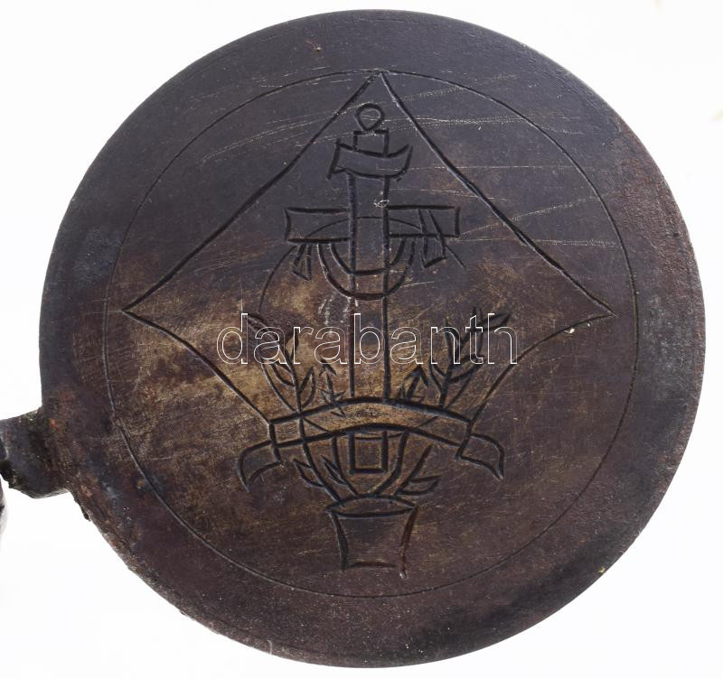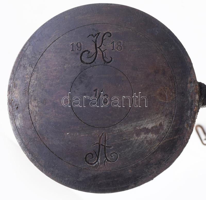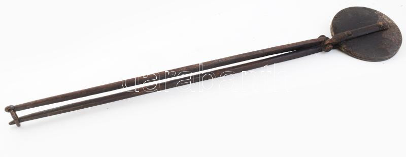 1918, Ostyasütő. Kovácsolt vas, egyik lapon a keresztre felfutó életfa motívumával, másik lapon dátummal és monogrammal, h: 82 cm /// A wrought iron ostya baker from 1918, featuring a tree of life motif climbing the cross on one side and a date with a monogram on the other side. It measures approximately 82 cm in height.