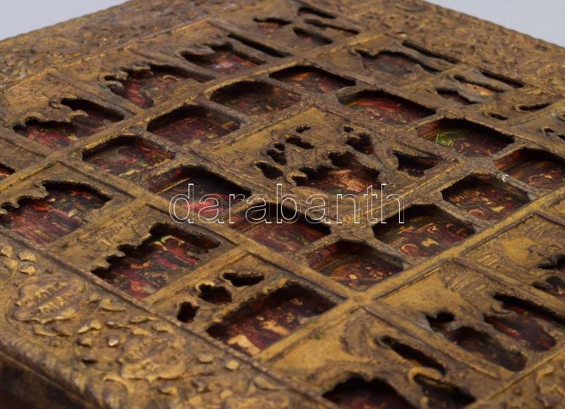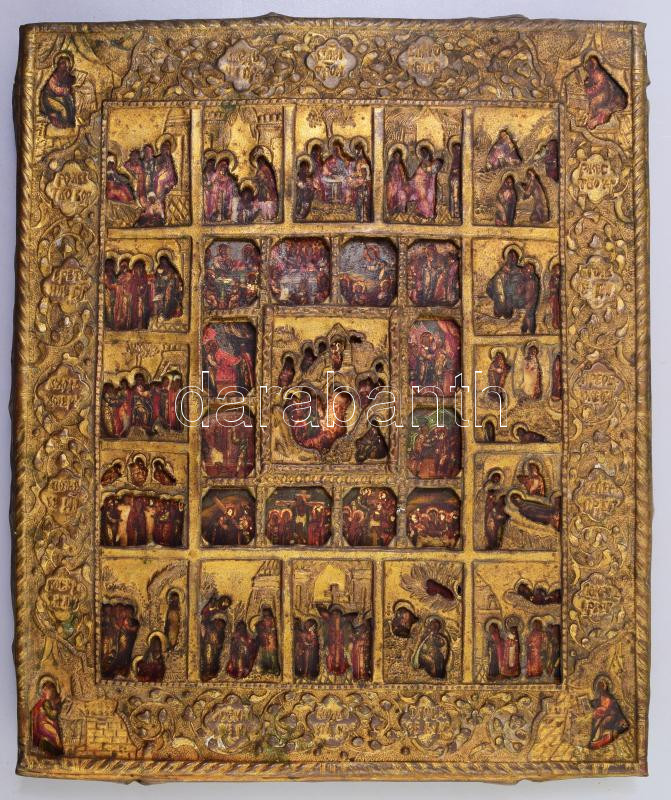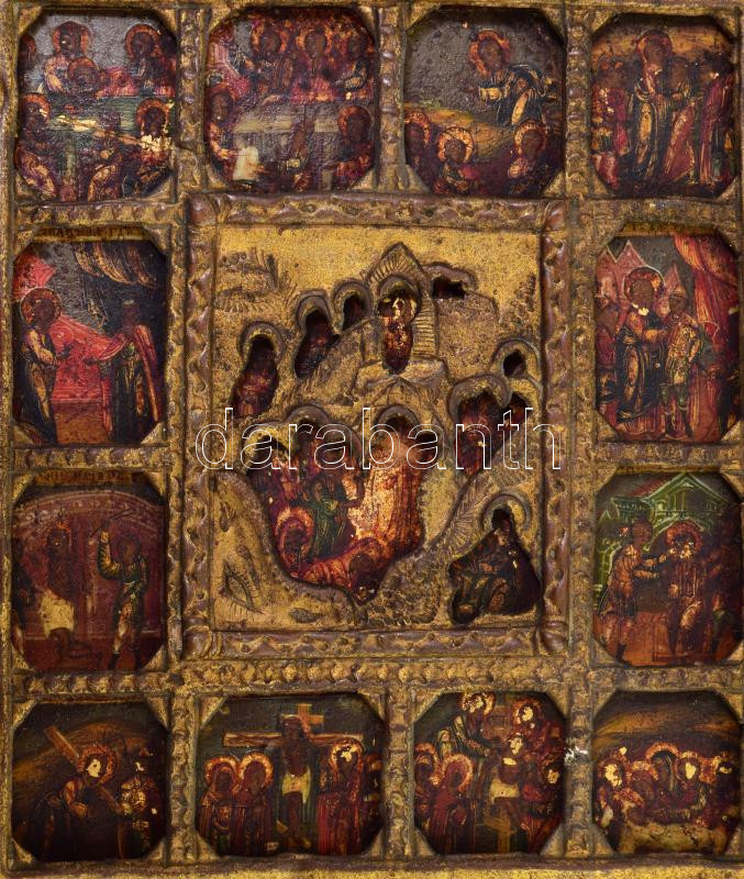 Húsvéti ünnepi ikon - Jézus pokolra szállása és feltámadása, körben ünnepekkel, sarkokon szentekkel. cca 19. sz. közepe, orosz, tojástempera, fa, rézlemez okláddal. Kopásokkal, 32x27 cm /// Easter festive icon - The Descent of Jesus into Hell and His Resurrection, surrounded by celebrations and saints in the corners. Circa mid-19th century, Russian, egg tempera on wood, with a brass plate. Some wear, measuring 32x27 cm.