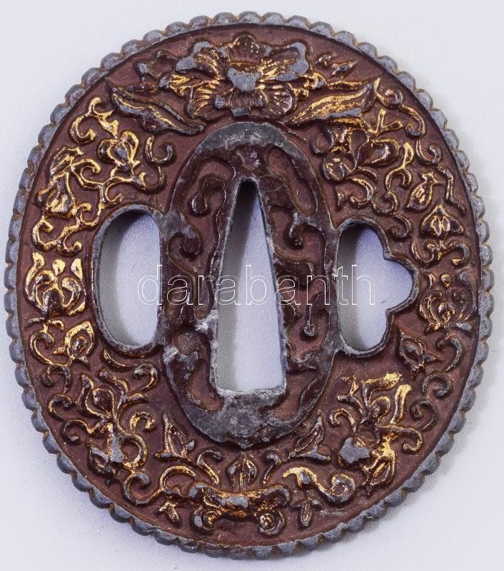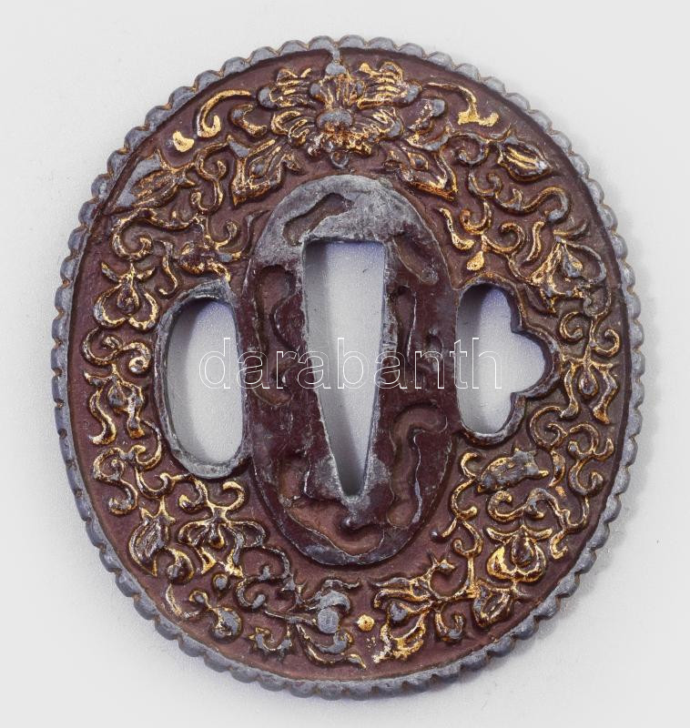 "Nanban" tsuba. Japán, cca 19. sz. Aranyozott fém, kopással, 6,5x6 cm, fa dobozban. /// "Nanban" tsuba. Japanese, circa 19th century. Gilded metal, with wear, 6.5 x 6 cm, in a wooden box.