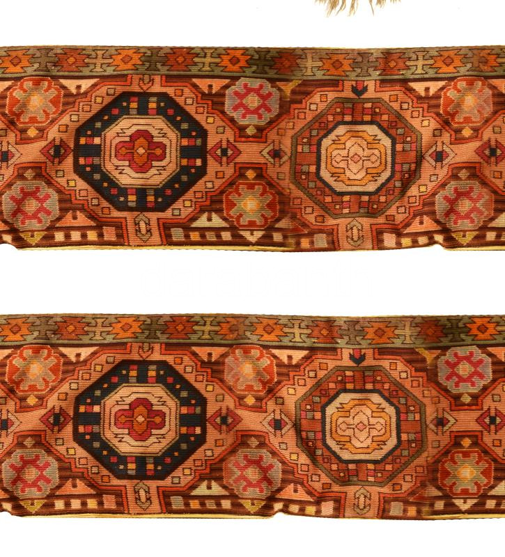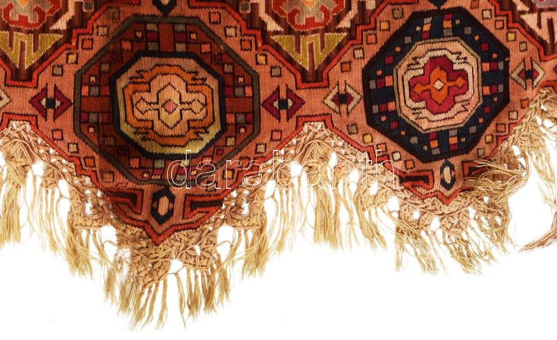cca 1930-1935 A Szent István-terem díszítésének mintázata alapján készült 3 darabos nagyméretű kelim szett: 2 darab nagyméretű fali futó cca 310x45 cm, és egy rojtos falitextil cca 165x75 cm rojtokkal. Korából adódó sérülésekkel. /// A large three-piece kilim set created based on the decoration pattern of the Szent István Hall, circa 1930-1935. The set includes two large wall runners measuring approximately 310x45 cm each and a fringed wall textile measuring about 165x75 cm, complete with fringes. The pieces show signs of wear consistent with their age.