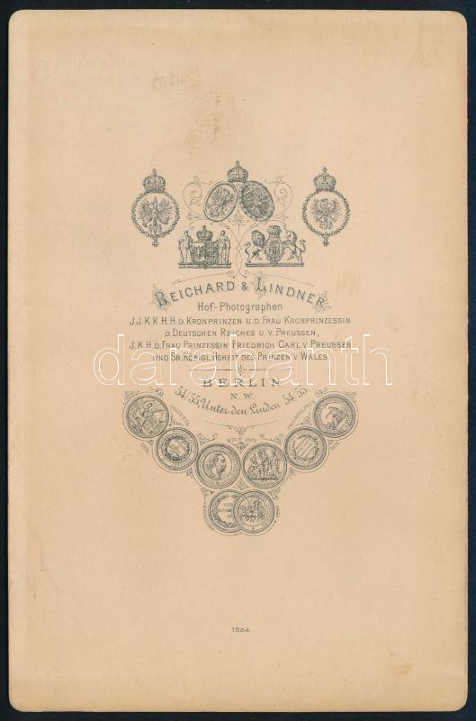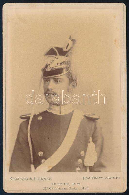 1884 Német ulánus (könnyűlovas) katonatiszt díszegyenruhás portréja (feltehetőleg előkelő, nemesi családból származó fiatal férfi); kabinetfotó Reichard & Lindner udvari fényképészek berlini műterméből, 16,5x10,5 cm // 1884 German uhlan (light cavalry) officer in full-dress uniform (a young man, likely from a noble family); cabinet card from the studio of Reichard & Lindner in Berlin, 16.5x10.5 cm